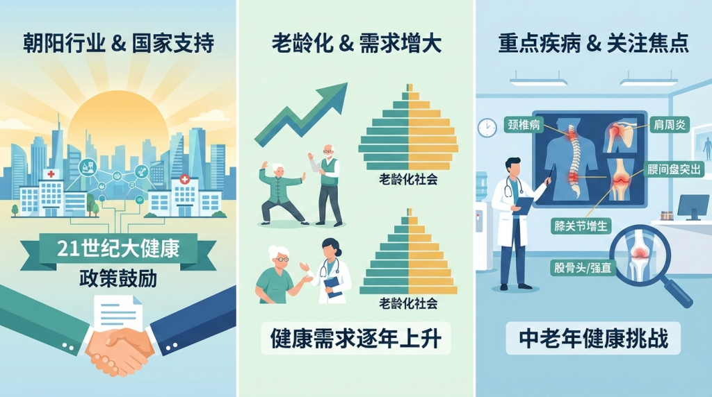 特别是颈椎病、肩周炎、腰间盘突出、膝关节骨质增生、股骨头坏死以及强直性脊柱炎这几类疾病,已然成为威胁中老年人健康的“头号杀手”,备受各界关注。